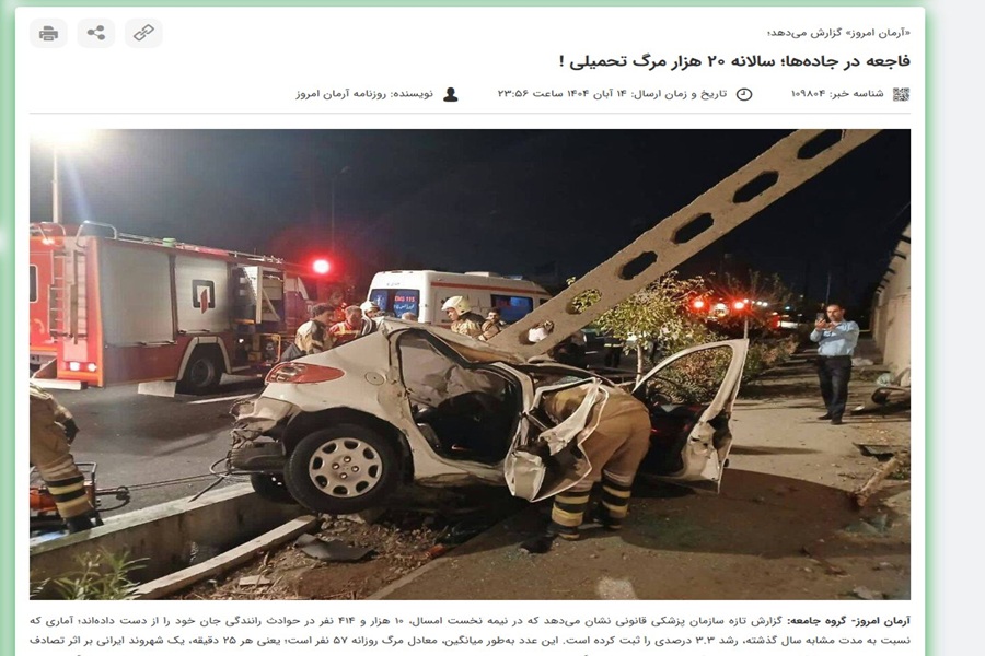 ترجمة عن صحيفة “آرمان امروز” الإصلاحية (بالعربية: الآمال اليوم) بعنوان “فاجعه در جادهها؛ سالانه ۲۰ هزار مرگ تحمیلی” (بالعربية: كارثة علي الطرقات.. عشرون ألف وفاة إجبارية سنويا) بتاریخ 14 آبان 1404 هــ. ش. الموافق ٥ نوفمبر ٢٠٢٥م.