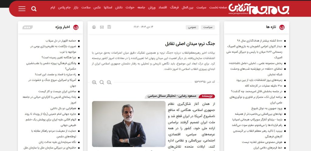 مقال مترجم عن موقع صحيفة جام جم الإلكترونية “جام جم” الحكومية التابعة لاتحاد الإذاعة والتلفزيون الإيراني، بعنوان: “جنگ نرم؛ میدان اصلی تقابل ” (بالعربية: الحرب الناعمة ساحة المواجهة الحقيقة) للمحلل السياسي مسعود رضايي.