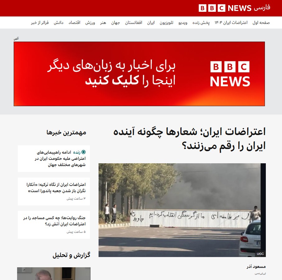 تحليل بعنوان “اعتراضات ایران، شعارها چگونه آینده ایران را رقم میزنند؟” (بالعربية: احتجاجات إيران، كيف تُشكّل الشعارات مستقبل البلاد؟) بقلم: مسعود آذر منشور في بي بي سي فارسي ٢٧ دى ١٤٠٤ هـ. ش. الموافق ١٧ يناير ٢٠٢٦م.