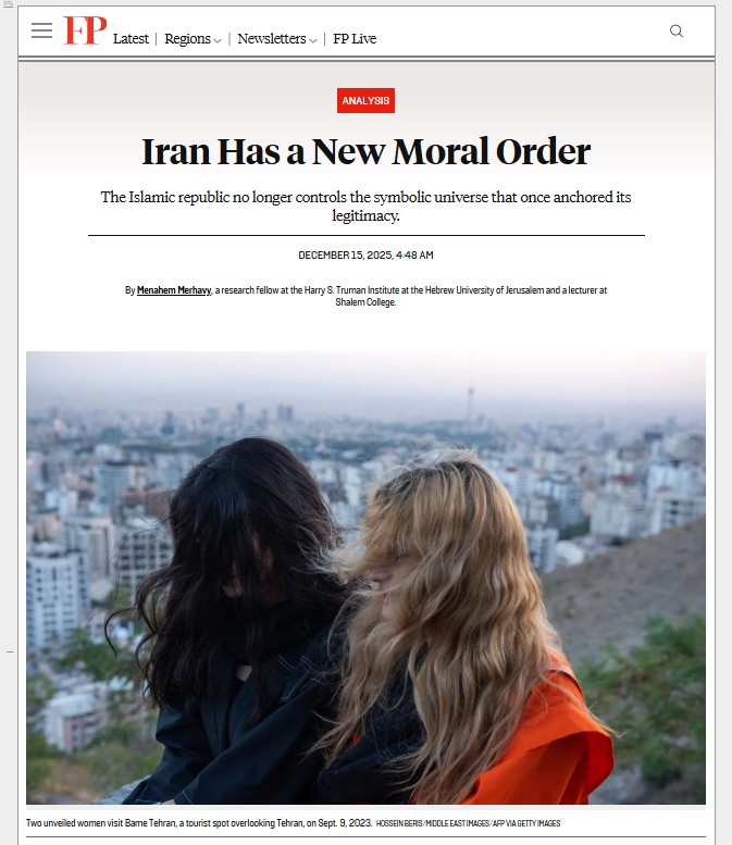 تحليل مترجم من مجلة فورين بوليسي الأمريكية: بعنوان “Iran Has a New Moral Order.. The Islamic republic no longer controls the symbolic universe that once anchored its legitimacy” (بالعربية: إيران أمام نظام أخلاقي جديد.. لم تعد الجمهورية الإسلامية تسيطر على الكون الرمزي الذي كان يؤسس في السابق لشرعيتها)، للكاتب الإسرائيلي المتخصص في الشؤون الإيرانية مناحيم مرحافي، بتاريخ 15 ديسمبر 2025م.