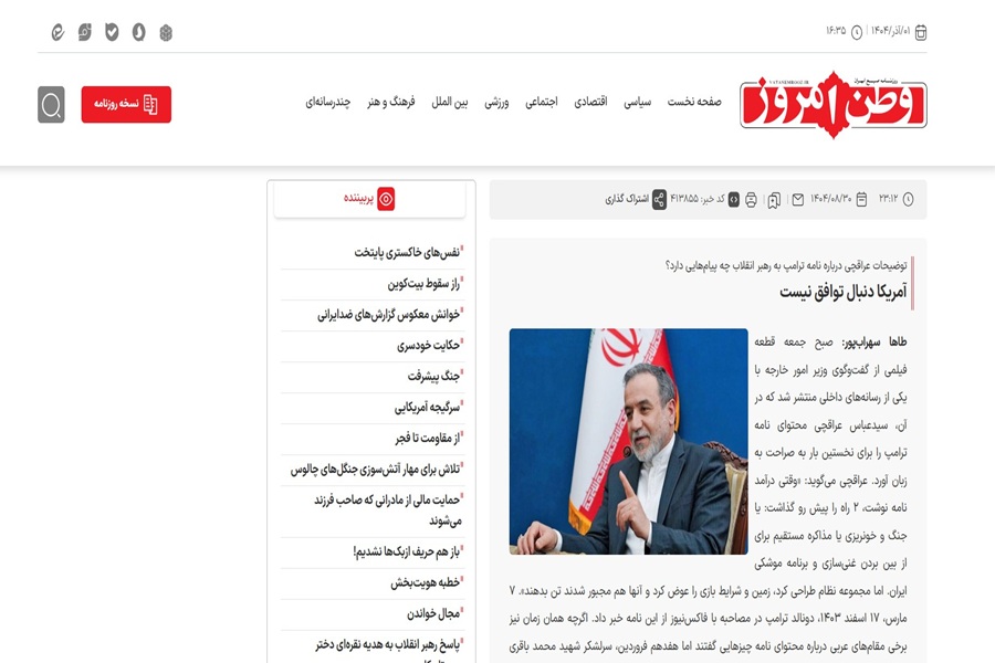 مقالة مترجمة من صحيفة “وطن امروز” الأصولية (بالعربية: الوطن اليوم) للكاتب طه سهراببور، بعنوان “توضیحات عراقچی درباره نامه ترامپ به رهبر انقلاب چه پیامهایی دارد؟ آمریکا دنبال توافق نیست” (بالعربية: ما الرسائل التي تحملها تصريحات عراقچي حول رسالة ترامب إلى قائد الثورة؟ أمريكا لا تسعى إلى اتفاق) بتاريخ 30 مهر 1404 هـ. ش. الموافق 21 نوفمبر 2025م.