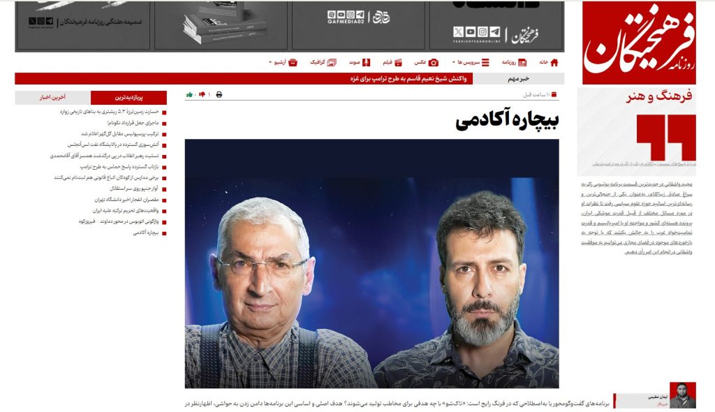 ترجمة لمقالة في جريدة “فرهيختگان” الأصولية بعنوان “بیچاره آکادمی” (بالعربية: الأكاديمية المسكينة)، نشرها الصحفی، إیمان عظیمي، يوم السبت ۱۲ مهر ۱۴۰۴ هـ. ش. الموافق، ٤ أكتوبر 2025.