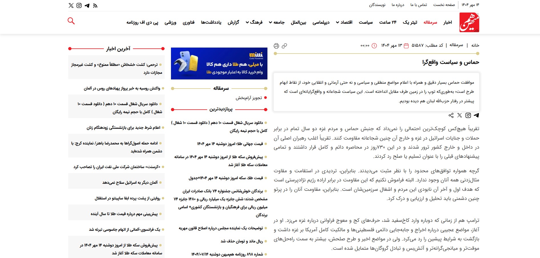 مقالة مترجمة من “سر مقاله” (بالعربية: الافتتاحية) في صحيفة هم ميهن بعنوان “حماس وسياست واقع گرا” (بالعربية: حماس وسياسة الواقعية) يوم ١٣ مهر ١٤٠٣ هـ. ش. الموافق ٥ أكتوبر ٢٠٢٥م.
