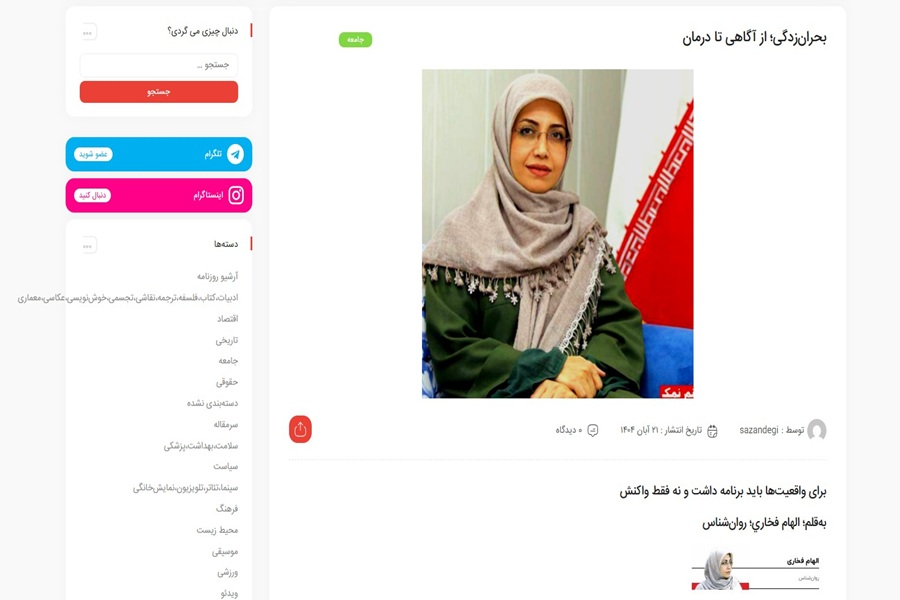 مقاله بعنوان “بحرانزدگی؛ از آگاهی تا درمان.. برای واقعیتها باید برنامه داشت و نه فقط واکنش” (بالعربية: الإصابة بداء الأزمات؛ من الوعي إلى العلاج.. يجب أن نواجه الواقع بخططٌ مسبقة، لا مجرد ردود أفعال). بقلم: إلهام فخاري، عالمة في علم النفس، منشورة في جريدة سازندگی الإصلاحية (بالعربية: البناء) بتاريخ ۲۱ آبان ۱۴۰۴ هـ. ش. الموافق 11 نوفمبر 2025م.