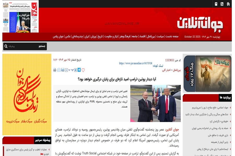 ترجمة مقال بعنوان: “آیا دیدار پوتین-ترامپ امید تازهای برای پایان درگیری خواهد بود؟” (بالعربية: هل سيكون لقاء بوتين – ترامب أملًا جديدًا لإنهاء الصراع؟) في صحيفة جوان (بالعربية: الشبان) بتاريخ : ۲۵ مهر ۱۴۰۴ هـ. ش. الموافق 17 أكتوبر 2025م.