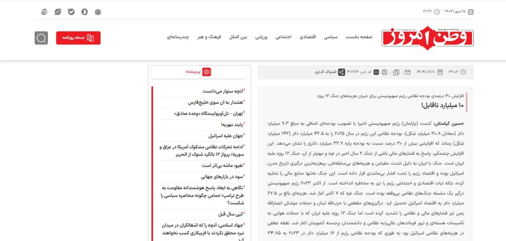 مقالة مترجمة عن الفارسية بجريدة “وطن امروز” المحافظة، أي “الوطن اليوم” للكاتب حسين كيامنش بعنوان “افزایش 30 در صدی بودجه نظامی رژیم صهیونیستی برای جبران هزینههای جنگ 12 روزه” (بالعربية: زيادة 30 بالمئة في ميزانية الكيان الصهيوني العسكري لتعويض نفقات حرب الاثني عشر يوما)، بتاريخ 11 مهر 1404 هـ. ش.، الموافق 3 أكتوبر 2025م.