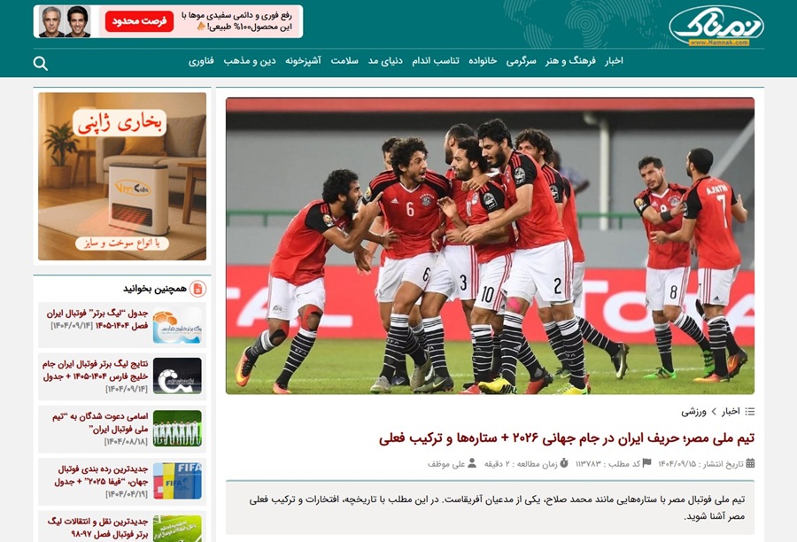 مقال بعنوان: “تيم ملى مصر؛ حريف ايران در جام جهانى ٢٠٢۶ + ستارهها و ترکیب فعلی” (بالعربية: منتخب مصر لكرة القدم منافس إيران في كأس العالم لعام ٢٠٢٦م؛ النجوم والتشكيل الحالي). بقلم: علي موظف؛ الناقد الرياضي، منشورة في المجلة الإلكترونية “نمناک” (بالعربية: الرطب) بتاريخ ١٥ آذر ١٤٠٤ هـ. ش. الموافق ٦ ديسمبر ٢٠٢٥م.