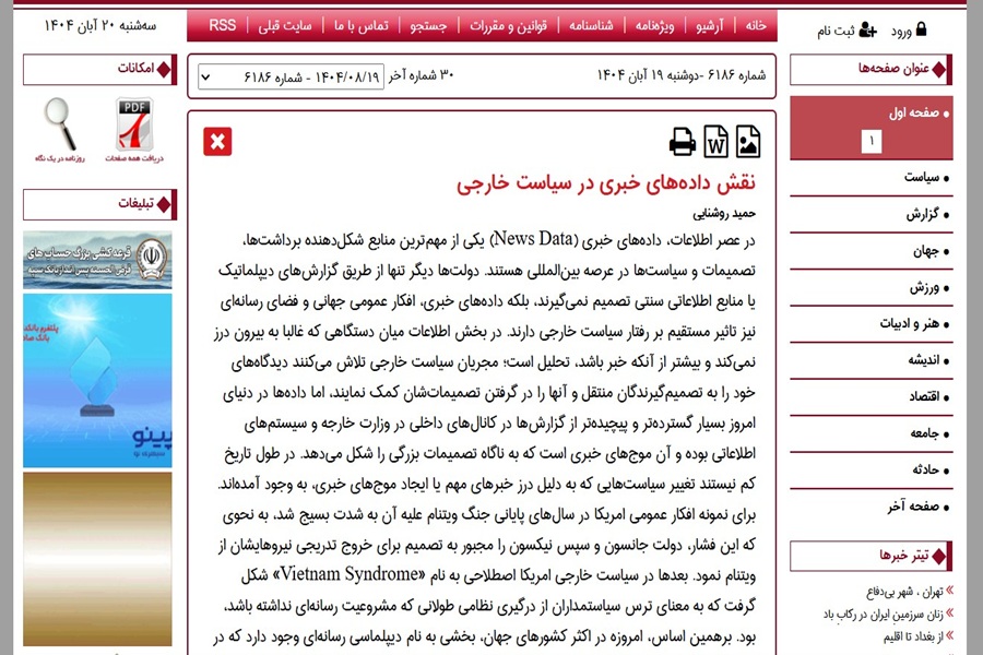ترجمة مقالة بعنوان “نقش دادههاي خبري در سياست خارجي” (بالعربية: دور البيانات الإخبارية في السياسة الخارجية) من موقع صحيفة “اعتماد” بقلم حميد روشنايي، بتاريخ: 19 آبان 1404 هـ. ش. الموافق وافق 10 نوفمبر 2025م.